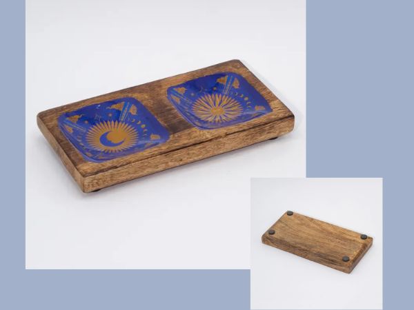 Découvrez ce plateau en bois au design émaillé où l'on peut voir le soleil et la lune, ces deux éléments représentent les forces opposées de la vie : le soleil est masculin, actif et expansif, tandis que la lune est féminine, passive et réceptive. Ensemble, ils représentent l'équilibre parfait.