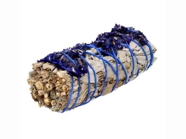 Sauge blanche aux fleurs de sinuata séchées bleues – fagot 11 cm